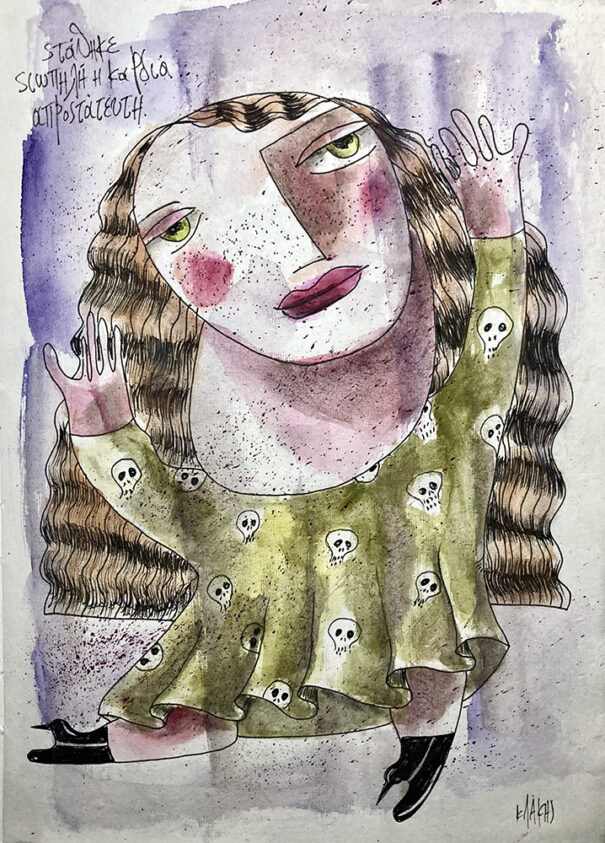 Η απροστάτευτη. Στάθηκε σιωπηλή η καρδιά, απροστάτευτη. Ακουαρέλα και μελάνι σε χειροποίητο χαρτί 21χ30 / 2022