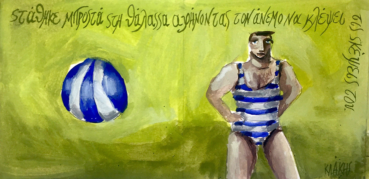 Ο άνεμος. Στάθηκε μπροστά στη θάλασσα αφήνοντας τον άνεμο να κλέψει τις σκέψεις του. Τέμπερα σε χαρτί/ 15χ7/ 2019