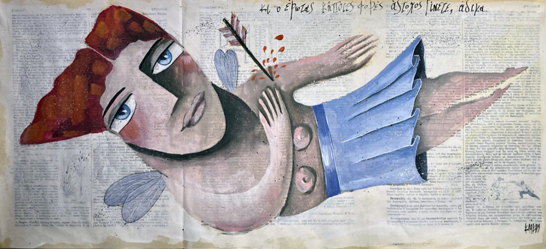 Ο άστοχος έρωτας. Κι ο έρωτας κάποιες φορές άστοχος γίνετε, άδικα. Έργο ζωγραφισμένο με τέμπερα πάνω σε σελίδα εγκυκλοπαίδειας του 1936 /63χ30/ 2022.