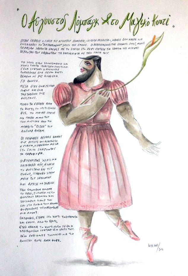 Ο Αύγουστος, τρομοκρατημένος, χωρίς να καταλάβει πώς και γιατί, γδύθηκε, φόρεσε τη φούστα και τις πουέντ, στάθηκε στη μέση του σαλονιού κι άρχισε να χορεύει.