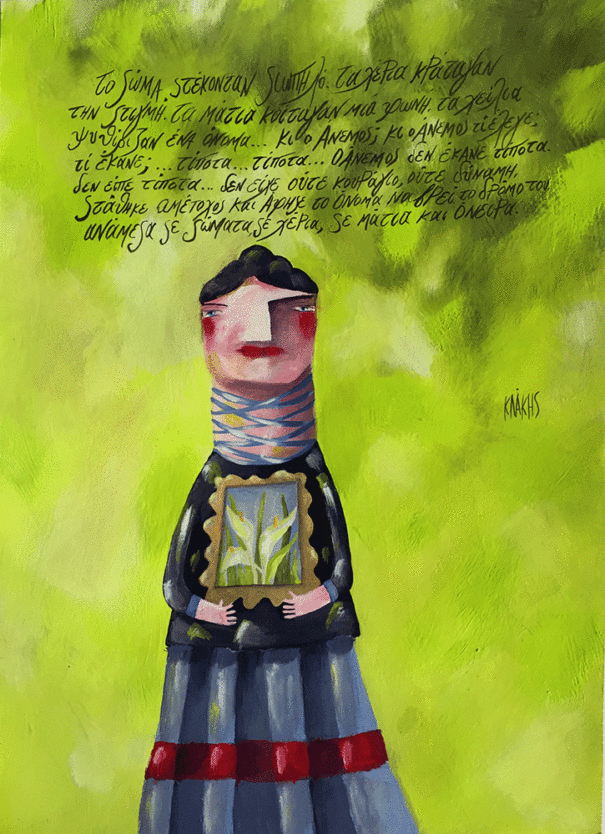 Το σώμα στέκονταν σιωπηλό. Τα χέρια κράταγαν τη στιγμή. Τα μάτια κοίταγαν μια φωνή, τα χείλια ψιθύριζαν ένα όνομα… κι ο άνεμος; Ο άνεμος τί έλεγε; Τί έκανε;… τίποτα… τίποτα… ο άνεμος δεν έκανε τίποτα.