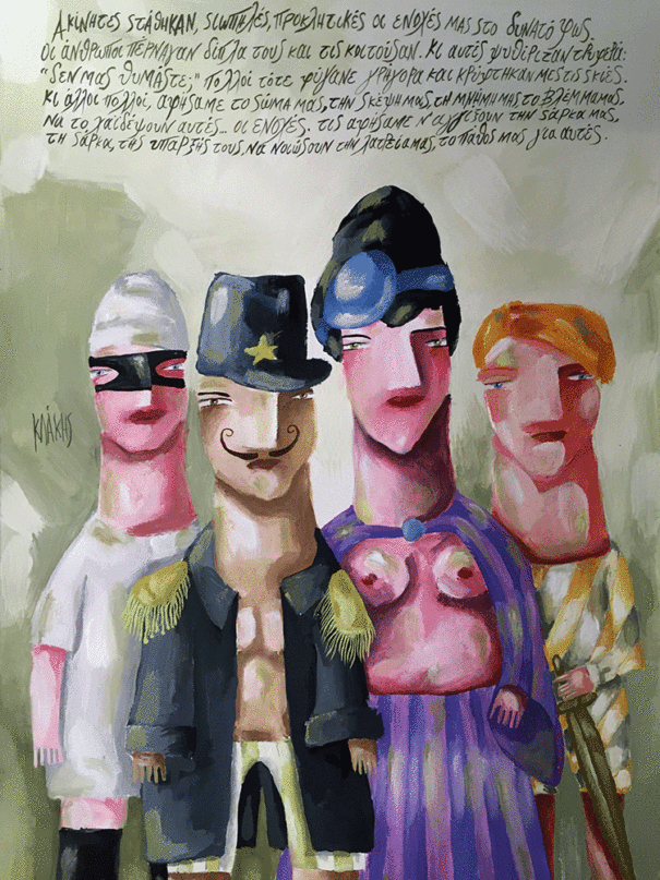 Ακίνητες στάθηκαν σιωπηλές οι ενοχές μας στο δυνατό φως. Άνθρωποι πέρναγαν δίπλα τους και τις κοιτούσαν κι αυτές ψιθύριζαν τρυφερά: Δε μας θυμάστε; Πολλοί τότε φύγανε γρήγορα και κρύφτηκαν μέσα στις σκιές, κι άλλοι πολλοί αφήσαμε το σώμα μας, τη σκέψη μας, τη μνήμη μας, το βλέμμα μας να το χαϊδέψουν αυτές… οι ενοχές. Τις αφήσαμε ν΄ αγγίξουν τη σάρκα μας, τη σάρκα της ύπαρξής τους, να νοιώσουν την αλήθεια μας, το πάθος ας για αυτές.